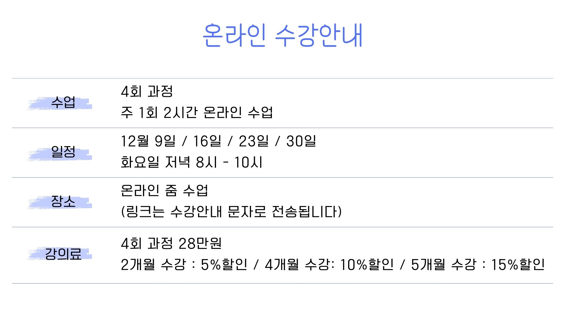 - 회당 2시간, 총 4회 수업