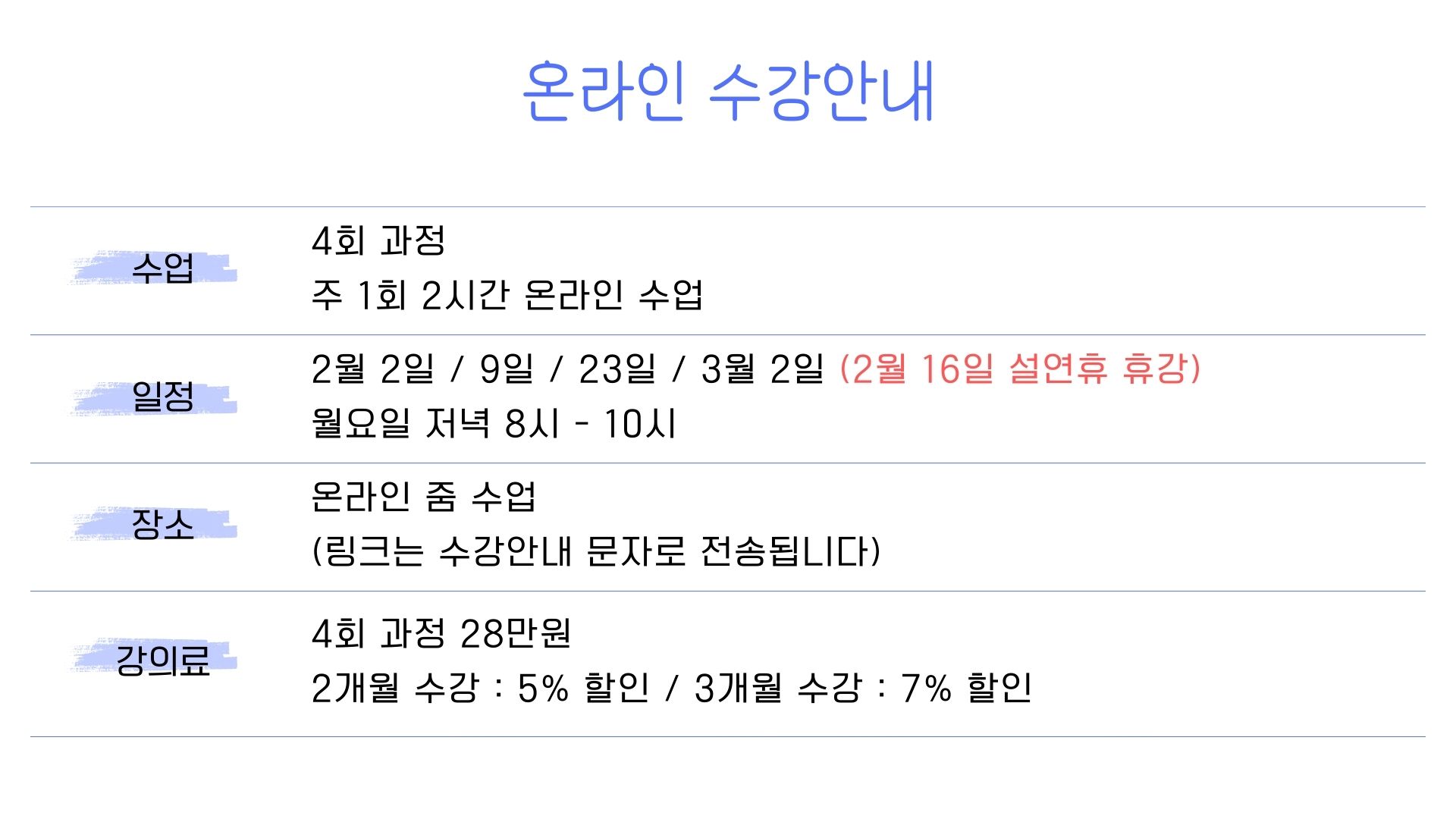 - 회당 2시간, 총 4회 수업