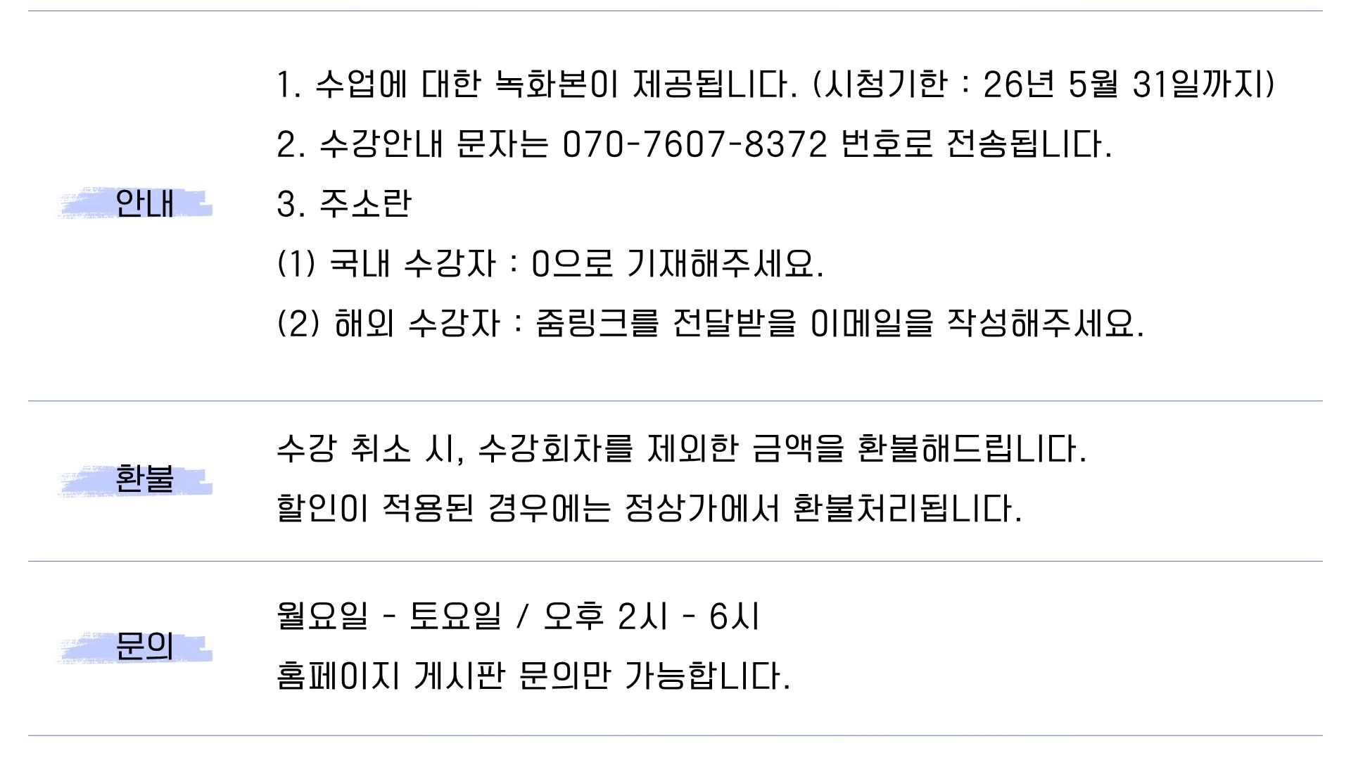 - 해외 수강이신 경우, 주소입력란에 줌링크 전송용 이메일 주소를 입력해주세요.